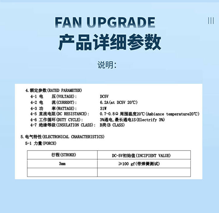 | 電壓: | DC5V | 行程: | 3mm | 電阻: | 0.7~0.8歐 | 功率: | 31W |